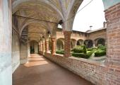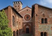 Riprando, vescovo di Novara, membro della famiglia dei signori di Biandrate, fonda l’abbazia tra il 1039 ed il 1053 sui resti di un antico complesso benedettino. Nel corso del Duecento, a causa della posizione strategica dell’edificio, il complesso viene fortificato una prima volta e si impone a lungo come centro di ricchezza materiale e spirituale. Agli inizi del XV secolo si edifica un ricetto per proteggere i contadini dalle scorrerie dei briganti, mentre l’abate Antonio Barbavara (1429-67), durante il suo lungo mandato, provvede a dare nuovo impulso all’abbazia ricostruendola quasi totalmente sulla planimetria originaria, e conferendo al complesso caratteristiche gotiche. Soltanto il campanile e il quadriportico non vengono toccati dall’intervento. Barbavara fa anche costruire un palazzo signorile per ricevere ospiti illustri, tra i quali spicca Galeazzo Maria Sforza. Alla sua morte, l’abbazia decade gradualmente, cadendo in commenda già nel 1497 e nel 1801, soppressa, viene venduta ai fratelli Isnard che la utilizzano come cascina. Quando nei primi anni del Novecento si risveglia l’interesse della Chiesa per il complesso monastico, gli edifici sono riscattati da alcuni parroci, i quali sin dal 1958 avviano lavori di restauro. Oggi l’abbazia fortificata si presenta con un quadriportico a due piani (XI secolo) che precede la chiesa a pianta longitudinale divisa in tre navate. La facciata, decorata con formelle in cotto, fa da cornice a un finestrone circolare che termina con tre pinnacoli di mattoni sormontati da croci. Il chiostro, assegnabile integralmente al XV secolo, benché di impianto più antico, conserva sulle pareti del registro inferiore i resti di un ciclo di affreschi sulla vita di San Benedetto. Per la costruzione della torre campanaria, possente, risalente alla fase più antica del complesso, sono stati utilizzati ciottoli di fiume disposti a spina di pesce, alternati a mattoni e pietre di reimpiego provenienti da edifici e tombe romane.