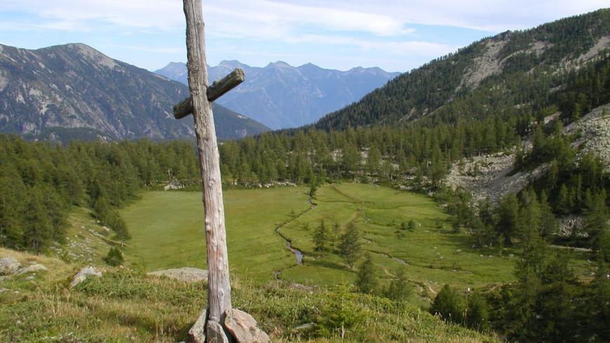 Da Gondo si entra in Zwischbergental. All’inizio il sentiero taglia i tornanti della strada carrozzabile. In località Hoff si attraversa sul ponte e si risale la valle sulla destra idrografica fino a poco prima del lago dove si torna sul versante sinistro; si costeggia quindi il lago fino a Zwischbergen. Da qui si prende il sentiero in direzione Passo del Monscera che taglia i tornanti della pista di alpeggio. Si tocca l’alpe Pussetta e con ultimo tratto ripido su gradini si raggiunge il Passo del Moscera e si entra in Italia. Si scende in diagonale al Rifugio Gattascosa e quindi toccando il Lago di Ragozza si scende fino a San Bernardo. Seguendo i segnavia D00 si scende a Gallinera e Gomba e infine si raggiunge Graniga.
