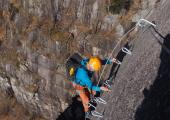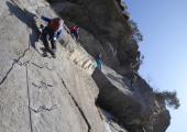 La Via Ferrata è un percorso prevalentemente artificiale che sale su ripide pareti rocciose attrezzate con cavi di acciaio di sicurezza e gradini ancorati alla roccia.