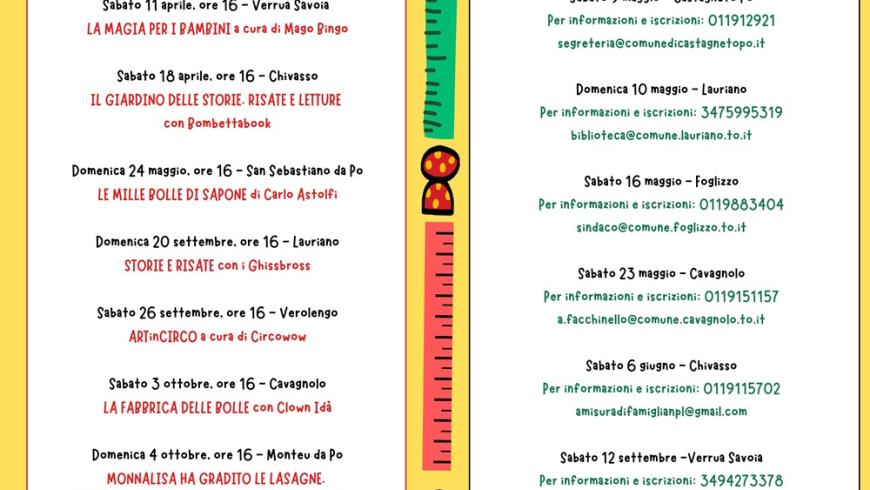 Passeggiate all'aria aperta che fanno bene alla salute dei bambini da 0 a 99 anni • sabato 9 maggio - Castagneto Po (t. 011.912921, segreteria@comunedicastagnetopo.it) • domenica 10 maggio - Lauriano (t. 347.5995319, biblioteca@comune.lauriano.to.it) • sabato 16 maggio - Foglizzo (t. 011.9883404, sindaco@comune.foglizzo.to.it) • sabato 23 maggio - Cavagnolo (t. 0119151157, a.facchinello@comune.cavagnolo.to.it) • sabato 6 giugno - Chivasso (t. 011.9115702, amisuradifamiglianpl@gmail.com) • sabato 12 settembre - Verrua Savoia (t. 3494273378, cinziasantangelo1967@gmail.com) • domenica 13 settembre - Monteu da Po (t. 011.9187813, anagrafe@comune.monteudapo.to.it) • sabato 19 settembre - Montanaro (t. 320.5617450, e.marchisio@comunemontanaro.it) • sabato 17 ottobre - San Sebastiano da Po (t. 339.5806352, candida_it@yahoo.com)