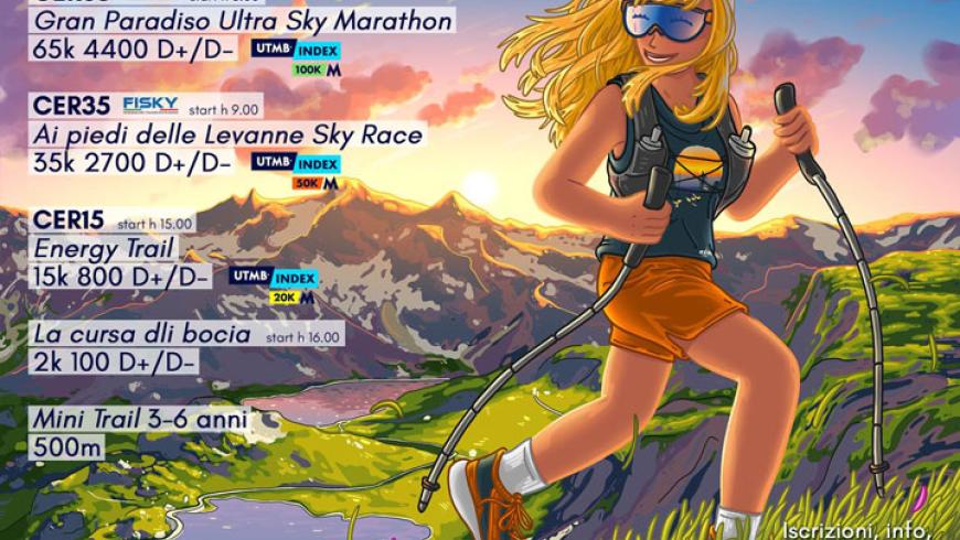 Di corsa tra la nuvole! Su e giù di corsa per le montagne di Ceresole Reale. • Gran Paradiso Ultra Sky Marathon, 65 km, 4.400 m D+/D- (calendario nazionale) • Ai Piedi delle Levanne Sky Race, 35 km, 2.700m D+/D- (calendario nazionale) • Energy Trail, 15k, 800 m D+/D- • La Cursa dli Bocia, 2 km, 100 m D+/D- (7-15 anni) • Mini Trail, 0.5 km (3-6 anni) E dalle ore 19.00: Beer&Music Fest.