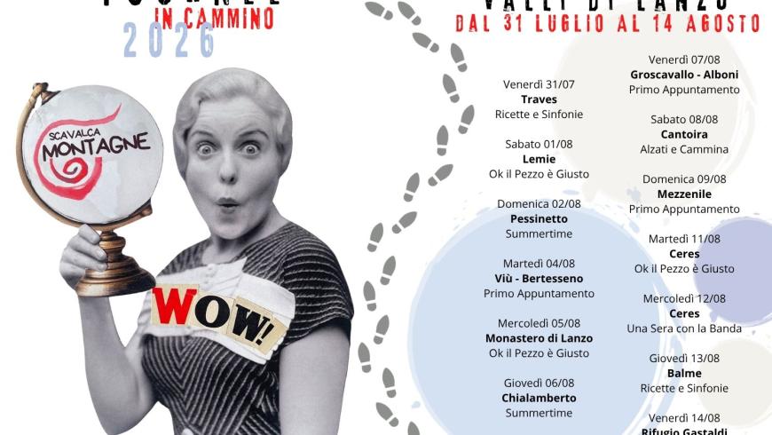 Una compagnia di artisti amanti della natura e della libertà ha deciso di portare i suoi spettacoli fuori dai teatri, in mezzo alla gente. Zaino in spalla realizza tournée interamente a piedi, camminando da un paese all’altro: la mattina si cammina, il pomeriggio si scoprono piccoli borghi e la sera si va in scena nelle loro stupende piazze. 3 mesi di cammino, 2 Regioni, 4 Province, più di 60 comuni attraversati, oltre 400 km di sentieri tra paesaggi mozzafiato, 8 spettacoli musicali: Un Gala di Operette, Ricette e Sinfonie, Summertime, Alzati e Cammina, Ok il Pezzo è Giusto e le nuove produzioni Primo Appuntamento, Non ti scordar… di che? e Il circo del giorno dopo. Le tappe sono a Chiaverano giovedì 18 giugno, Burolo venerdì 19, Bollengo sabato 20, Albiano d’Ivrea domenica 21; Traves venerdì 31 luglio, Lemie sabato 1 agosto, Pessinetto domenica 2, Viù martedì 4, Monastero di Lanzo mercoledì 5, Chialamberto giovedì 6, Groscavallo venerdì 7, Cantoira sabato 8, Mezzenile domenica 9, Ceres martedì 11 e mercoledì 12, Balme giovedì 13, Rifugio Gastaldi venerdì 14. Prendi uno zaino, metti le scarpe da trekking, armati di curiosità ed allegria e raggiungici sul cammino.
