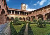 Riprando, vescovo di Novara, membro della famiglia dei signori di Biandrate, fonda l’abbazia tra il 1039 ed il 1053 sui resti di un antico complesso benedettino. Nel corso del Duecento, a causa della posizione strategica dell’edificio, il complesso viene fortificato una prima volta e si impone a lungo come centro di ricchezza materiale e spirituale. Agli inizi del XV secolo si edifica un ricetto per proteggere i contadini dalle scorrerie dei briganti, mentre l’abate Antonio Barbavara (1429-67), durante il suo lungo mandato, provvede a dare nuovo impulso all’abbazia ricostruendola quasi totalmente sulla planimetria originaria, e conferendo al complesso caratteristiche gotiche. Soltanto il campanile e il quadriportico non vengono toccati dall’intervento. Barbavara fa anche costruire un palazzo signorile per ricevere ospiti illustri, tra i quali spicca Galeazzo Maria Sforza. Alla sua morte, l’abbazia decade gradualmente, cadendo in commenda già nel 1497 e nel 1801, soppressa, viene venduta ai fratelli Isnard che la utilizzano come cascina. Quando nei primi anni del Novecento si risveglia l’interesse della Chiesa per il complesso monastico, gli edifici sono riscattati da alcuni parroci, i quali sin dal 1958 avviano lavori di restauro. Oggi l’abbazia fortificata si presenta con un quadriportico a due piani (XI secolo) che precede la chiesa a pianta longitudinale divisa in tre navate. La facciata, decorata con formelle in cotto, fa da cornice a un finestrone circolare che termina con tre pinnacoli di mattoni sormontati da croci. Il chiostro, assegnabile integralmente al XV secolo, benché di impianto più antico, conserva sulle pareti del registro inferiore i resti di un ciclo di affreschi sulla vita di San Benedetto. Per la costruzione della torre campanaria, possente, risalente alla fase più antica del complesso, sono stati utilizzati ciottoli di fiume disposti a spina di pesce, alternati a mattoni e pietre di reimpiego provenienti da edifici e tombe romane.
