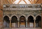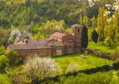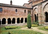 In una piccola valle dell’astigiano, fra morbide colline coperte da vigneti, si trova il più importante monumento romanico del Piemonte: l’Abbazia di Vezzolano. Secondo la leggenda (notissima, ma priva di qualunque riscontro documentario), l’abbazia sarebbe stata fondata per volere di Carlo Magno nel 773: colto da una crisi epilettica nel corso di una battuta di caccia nei pressi di Albugnano, a guarigione avvenuta, Carlo avrebbe ordinato di far erigere un’abbazia in onore della Madonna. Certamente, comunque, in epoca medievale Vezzolano conobbe un fase di notevole potere e ricchezza e ancora oggi è uno dei monumenti romanici più visitati del Piemonte. Imboccando il sentiero in mezzo al verde in una quiete assoluta, l´abbazia si scorge all´improvviso. Il sobrio campanile, collocato come vuole la tradizione romanica sul lato sinistro, si mostra basso e tozzo. La facciata, decorata da capitelli e statue, alterna ai mattoni fasce in arenaria e presenta un bel portale con bassorilievi, introducendo alla chiesa, attestata sin dal 1095, ma rimaneggiata ampiamente in seguito. L’interno, in alcuni tratti di forme attestanti la transizione al gotico, è tagliato in due settori dal pontile o jubé inserito in epoca successiva (fine XII secolo), dalla ricchissima decorazione a bassorilievo raffigurante i 35 patriarchi antenati di Maria, la Deposizione del Corpo di Maria, L’Assunzione e il trionfo in cielo accanto a simboli evangelici. Dalla chiesa, attraverso una piccola porta, si accede al chiostro, uno dei meglio conservati del Piemonte, dove elementi di epoche diverse e affreschi del XIII e XV secolo, magnificamente conservati nel tempo, coesistono avvolti dal silenzio in perfetta armonia.