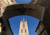 La cattedrale di Susa, consacrata nel 1027 e dedicata a S. Giusto è nominata cattedrale nel 1772, con l’istituzione della diocesi di Susa. La chiesa è caratteristica dalla facciata addossata ad una delle grandi torri circolari di origine romana che chiudono ai lati la porta Savoia. Risale alla prima metà del XII secolo l’ampliamento delle navate dell’originale monastero con il loro allungamento verso ovest sino a inglobare la cinta difensiva in corrispondenza della navata centrale per creare l’ingresso dall’esterno dell’abitato. Interessante, per la sua portata innovativa e per l’introduzione di complesse soluzioni strutturali nell’architettura dell’area subalpina, è l’intervento gotico sulla fabbrica: dell’impianto originario si conservano solo parti del presbiterio, i bracci del transetto voltati a botte e il corpo longitudinale a tre navate, fino alla quarta campata dall’ingresso; sono realizzati ex novo il catino absidale, la volta del presbiterio e quella del coro. L’altare maggiore marmoreo risale al 1724 e si deve al disegno dall’architetto Ignazio Bertola. E’ sotto il vescovo Giovanni Antonio Odone che è promosso l’ultimo importante intervento architettonico sulla fabbrica: tra il 1863 e il 1866 Edoardo Arborio Mella progetta e fa eseguire dal pittore Giuseppe Guglielmino e dalla sua equipe di collaboratori la decorazione interna, attualmente visibile.