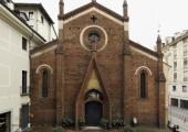 La Chiesa di San Domenico risale alla seconda metà del XIII secolo, quando i domenicani si insediano a Torino stabilendosi in prossimità delle mura cittadine, tra l’area del mercato e la porta settentrionale della città. Nel corso del Trecento il primo edificio originario viene sostituito da uno più esteso, poi ancora ampliato e dotato alla metà del XV secolo di un campanile. Definitivamente rimaneggiata nel Seicento, e coinvolta nel provvedimento del 1729 per il “dirizzamento della Contrada di Porta Palazzo e del Senato, che la priva di due navate minori orientali, la chiesa assume un aspetto barocco che nasconde la matrice gotica originale, poi riportata alla luce dall’intervento di restauro di Riccardo Brayda e Alfredo d’Andrade del 1906-1909. San Domenico, unico esempio torinese di chiesa gotica, viene quindi ridecorato secondo l’intero repertorio stilistico del Trecento piemontese. La chiesa conserva nella Cappella delle Grazie, posta al di sotto del campanile, un ciclo di affreschi trecenteschi: una bellissima Annunciazione circondata dai Dodici Apostoli pesantemente integrata da Giovanni Vacchetta.
