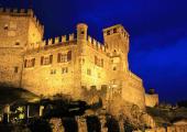 A pochi chilometri da Ivrea, il Castello di Pavone, domina il borgo e la pianura sottostanti. Il castello ha origini antiche: pare infatti che l’edificazione delle mura fortificate risalga all’XI secolo, mentre gli altri corpi di fabbrica sarebbero stati costruiti tra il XII e il XIV secolo. All’inizio del XIII secolo il castello passa ai signori Romano e, qualche anno dopo, Oberto, nuovo vescovo d’Ivrea, lo riacquista. Nel Trecento si verifica la prima e importante ristrutturazione dell’edificio. Nel Quattrocento il castello viene abbandonato, ma alla fine del secolo il vescovo Bonifacio Ferrero dà avvio a nuovi interventi di ristrutturazione che riguardano la costruzione di uno scalone, l’ampliamento della zona abitativa e il recupero esterno della torre. Le guerre tra Francesco I e Carlo V procurano nuovi danni e distruzioni al palazzo che a seguito delle invasioni napoleoniche risulta praticamente distrutto. Nel 1885 l’architetto Alfredo D’Andradelo acquista e avvia un imponente lavoro di riprogettazione, basandosi sullo studio dei castelli canavesani e aostani. Le mura di cinta di Pavone vengono assorbite dal corpo centrale che assume così una pianta a forma di nave, mentre dal Castello di Strambino, in completo stato di abbandono, viene prelevato il soffitto per inserirlo a Pavone. Per le scuderie e l’innalzamento dell’ala occidentale, ispirate all’architettura cinquecentesca, D’Andradeimpiega un cotto simile a quello utilizzato per i Castelli di Albiano e Ozegna e fa realizzare decorazioni simili a quelle del Castello di Strambino. Sempre sua è l’idea di far collocare un grande pavone in bronzo in direzione di Ivrea, persuaso che da esso derivi il nome del paese. Dichiarato monumento nazionale nel 1981, da alcuni anni ospita un hotel-ristorante e un centro congressi.