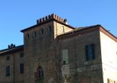 La forma quadrilatera, che racchiude un vasto cortile, è sottolineata da due massicce torri quadrate decorate con archetti in cotto, mentre un fossato trasformato in giardino segue il perimetro fortificato.