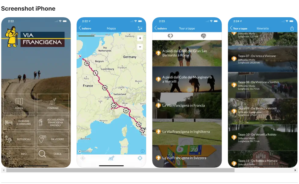 L’App per iPhone e Android consente la navigazione GPS lungo l’intero percorso della Via Francigena da Canterbury (Kent, Inghilterra) a Roma (Lazio, Italia), più di 2200 km divisi in 104 tappe.